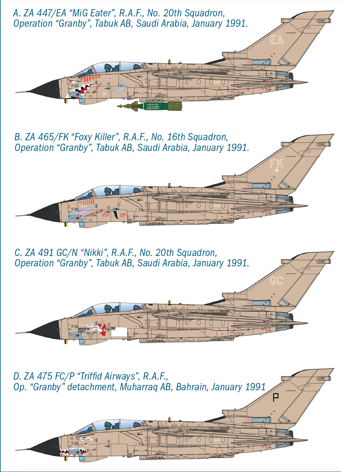 Il progetto del Tornado è nato dalla collaborazione di Italia, Germania e Regno Unito per la realizzazione di un aereo da combattimento multiruolo dalle alte prestazioni di volo. Venne così sviluppato un aereo bimotore, con configurazione biposto ed ali a geometria variabile per meglio rispondere al suo ruolo principale: caccia bombardiere supersonico a bassa quota in grado di “seguire” il profilo del terreno. Il Tornado IDS (Interdictor/strike), ideale per le missioni di attacco, è stato il primo ad essere impiegato dai reparti operativi di volo dei tre Paesi che svilupparono il progetto. Nello specifico gli esemplari destinati alla Royal Air Force Britannica vennero rinominati Gr.1 e vennero impiegati attivamente, svolgendo un elevato numeri di missioni, durante la guerra del Golfo del 1991.