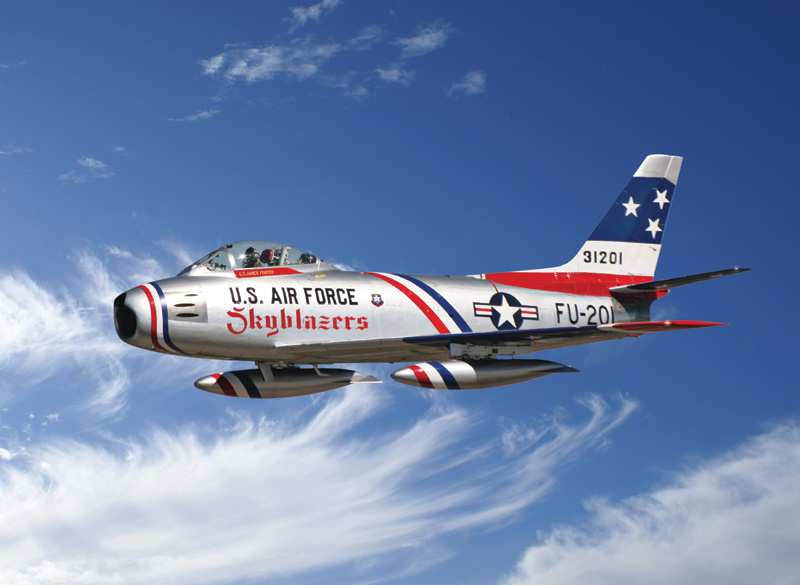 La pattuglia acrobatica dell'aviazione americana denominata “Skyblazers” venne formata nel 1949 da piloti selezionati del 36° Stormo sulla base di Furstenfeldbruck, in Germania, allo scopo di dimostrare la presenza militare degli Stati Uniti per la difesa dell'Europa occidentale in quel periodo di dura contrapposizione con l'Unione Sovietica. Inizialmente la pattuglia, formata da quattro velivoli, si esibì con l'F-80 e appena il reparto d'origine ricevette i più prestanti F-84E Thunderjet passò immediatamente al nuovo aereo, con il quale si esibì in 260 manifestazioni aeree in circa tre anni, visitando 12 paesi europei. Nel corso del 1953 il reparto venne trasferito sotto il comando del 48° Stormo, basato in Francia e ricevette in dotazione l'F-86 F Sabre.Con questo aereo, gli “Skyblazers” rappresentarono l'America sino al 1962, quando il reparto, nel frattempo trasferitosi sulla base di Bitburg in Germania, venne sciolto perchè venne meno la necessità di una formazione di rappresentanza specifica basata in Europa. All'inizio degli anni '60 la tecnica del rifornimento in volo divenne una procedura standard per gli aerei americani, quindi era possibile dagli Stati Uniti raggiungere qualsiasi luogo nel mondo senza scali intermedi. Di conseguenza la pattuglia acrobatica dei “Thunderbirds” formata in America negli anni '50 divenne la sola formazione ufficiale di rappresentanza dell'aviazione americana.