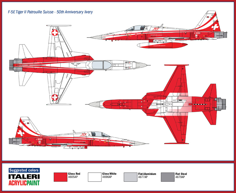 Il Northrop F-5 nacque negli anni sessanta per soddisfare le necessità di molti Paesi appartenenti alla NATO che richiedevano un caccia multiruolo semplice, economico e di facile manutenzione. All’inizio degli anni settanta venne sviluppata la versione migliorata, denominata F-5E Tiger II, che si caratterizzava per l’adozione dei nuovi propulsori General Electric J85 in grado di fornire una spinta decisamente superiore. Rispetto ai primi F-5, il Tiger II ha una fusoliera più allungata, maggiore autonomia operativa ed un’avionica ottimizzata per adempiere al ruolo primario di caccia da difesa aerea. L’armamento di base è costituito da due cannoni da 20 mm., installati nel muso sotto la cabina, e dalla possibilità di utilizzare svariate combinazioni di missili aria-aria. L’F-5E ha avuto un grande successo commerciale. E’ stato inoltre prodotto su licenza in Corea del Sud, Taiwan e Svizzera, dove nel 1995 fu scelto come velivolo dalla pattuglia acrobatica nazionale “Patrouille Suisse”.