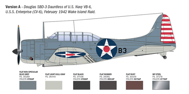 Il monomotore ad ala bassa Douglas SBD “Dauntless” è stato il bombardiere in picchiata imbarcato più utilizzato dalla U.S. Navy durante la Seconda Guerra Mondiale. Entrato in servizio attivo presso i reparti di volo americani nel corso del 1941 poteva essere impiegato sia per la ricognizione che per l’attacco in picchiata. L’SBD-3 fu il vero e proprio eroe della battaglia delle Midway (giugno del 1942), punto di svolta della Guerra nel Pacifico, dove contribuì in modo significativo all’affondamento delle portaerei giapponesi. Dotato di un motore radiale Wright R-1820 Cyclone, poteva raggiungere la velocità massima di 410 km/h. L’SBD-3 poteva trasportare quasi 2000 Kg di bombe. Era inoltre equipaggiato con due mitragliatrici anteriori da 12,7 mm e due posteriori da 7,62 mm. Venne particolarmente apprezzato dagli equipaggi per la sua robustezza e solidità costruttiva.